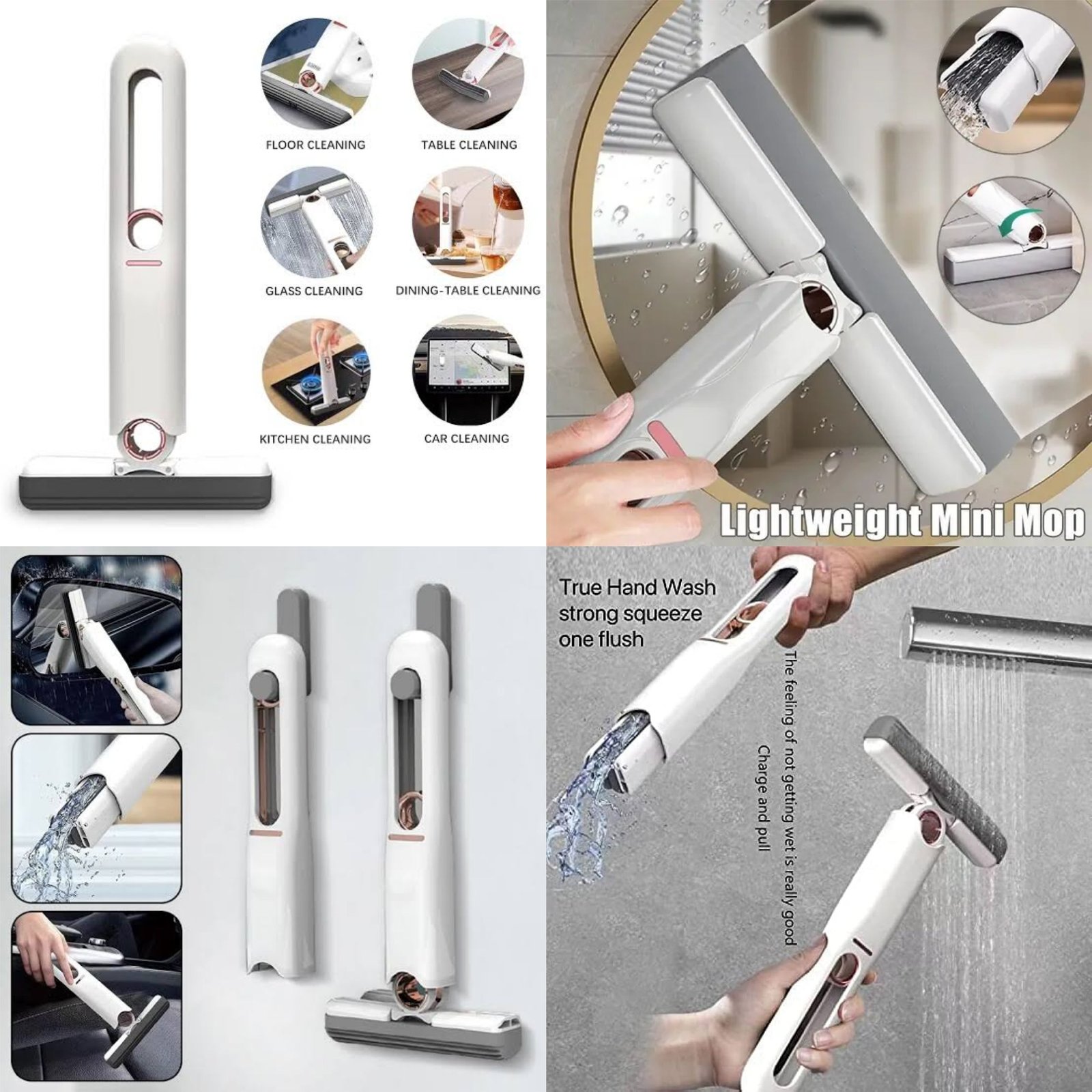 The Mini Multipurpose Squeeze Mop is your perfect everyday cleaning companion. Designed for convenience, it features a built-in squeezing function so you never have to touch a dirty mop pad. Its 360? rotating head makes it easy to clean corners, edges, and under furniture, while the microfiber pad ensures efficient absorption and thorough dust pickup. Compact and versatile, this mop is ideal for quick cleanups in kitchens, bathrooms, desktops, or any small space.